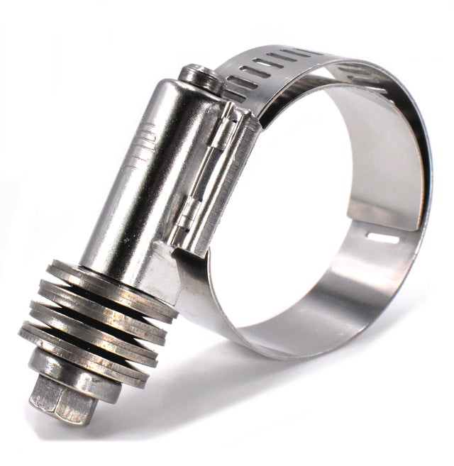 Jolly Brand's constant tension hose clamps are a superior form of clamps designed to eliminate "cold flow" leaks with their Belleville spring mechanism. This allows the clamp to automatically expand and contract as the engine temperature increases and decreases. They also feature an extended inner liner which protects softer hoses such as silicone from the worm gear serrations. The 9/16" band, housing and screw are made from stainless steel.